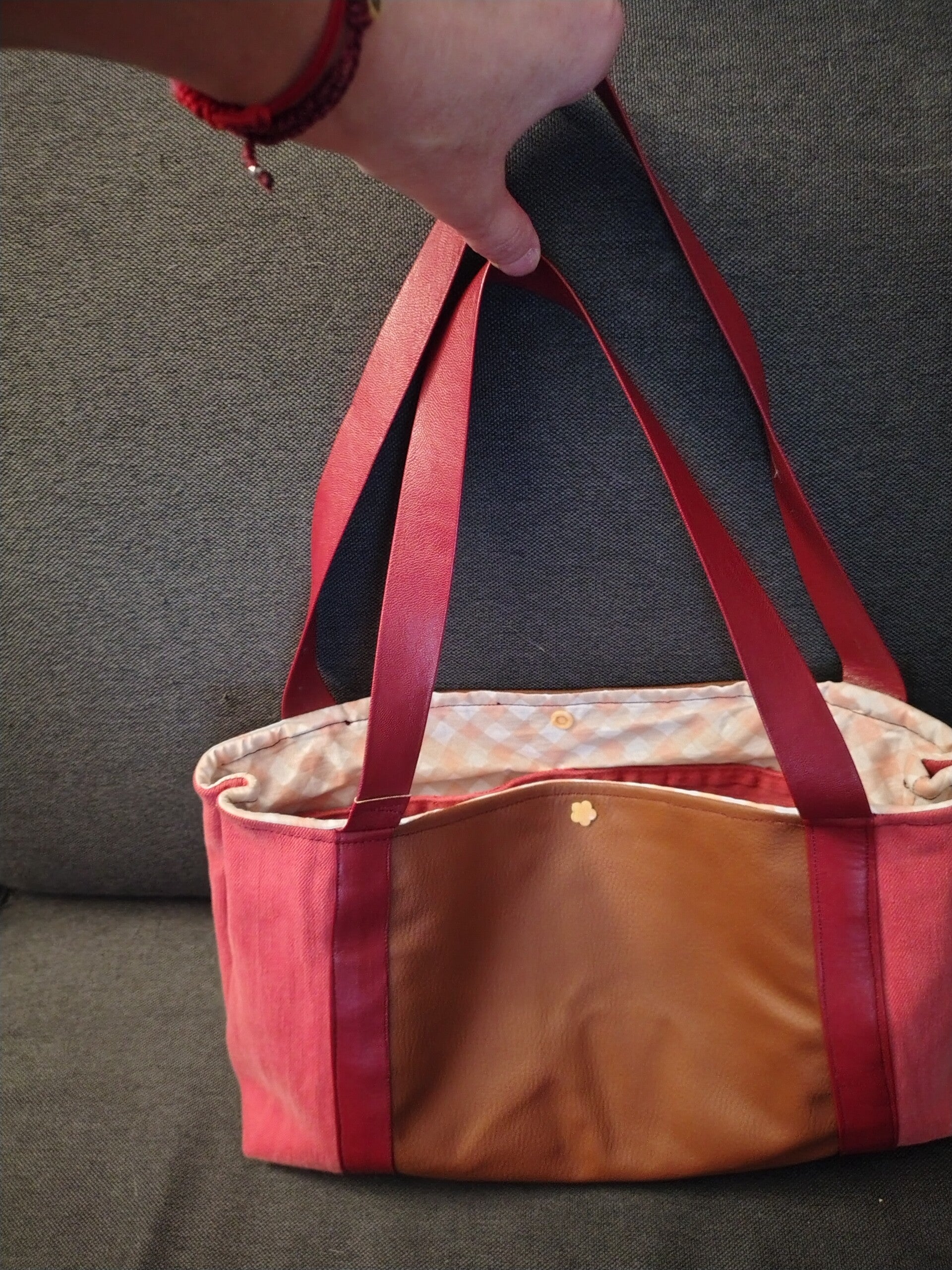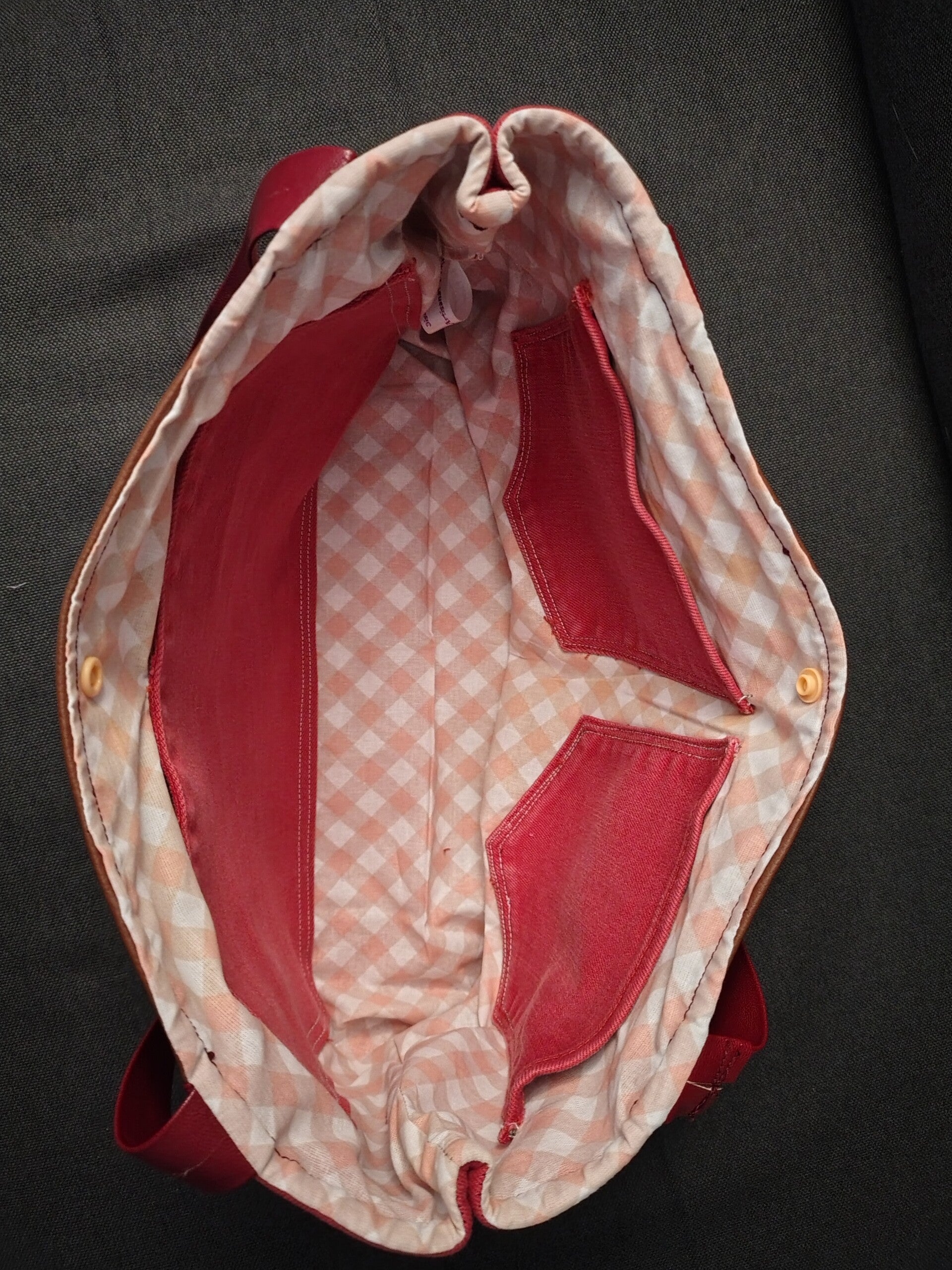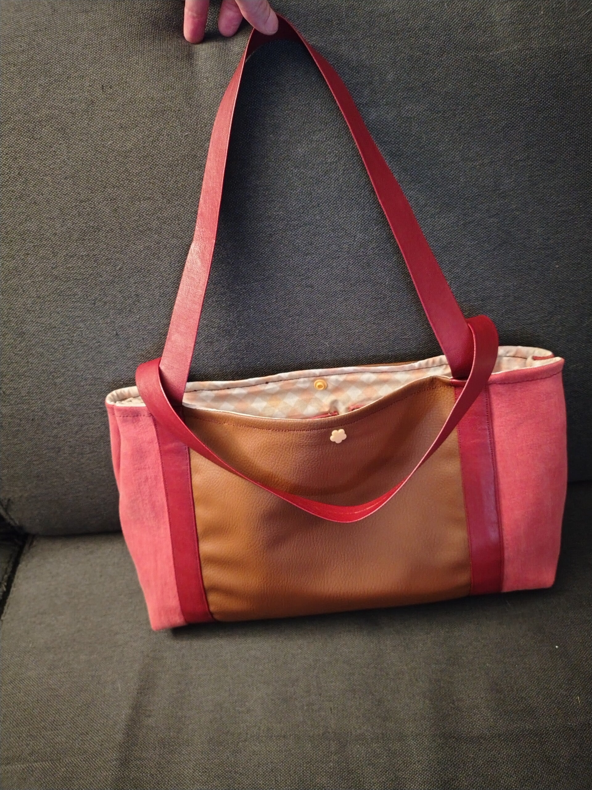 Extérieur en simili cuir camel et tissu rouge profond, anses assorties pour un porté épaule confortable.